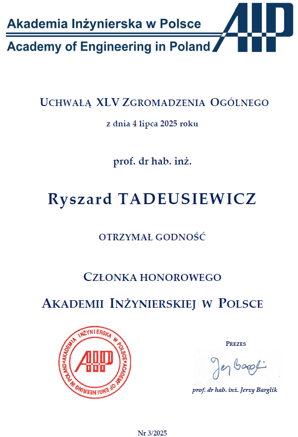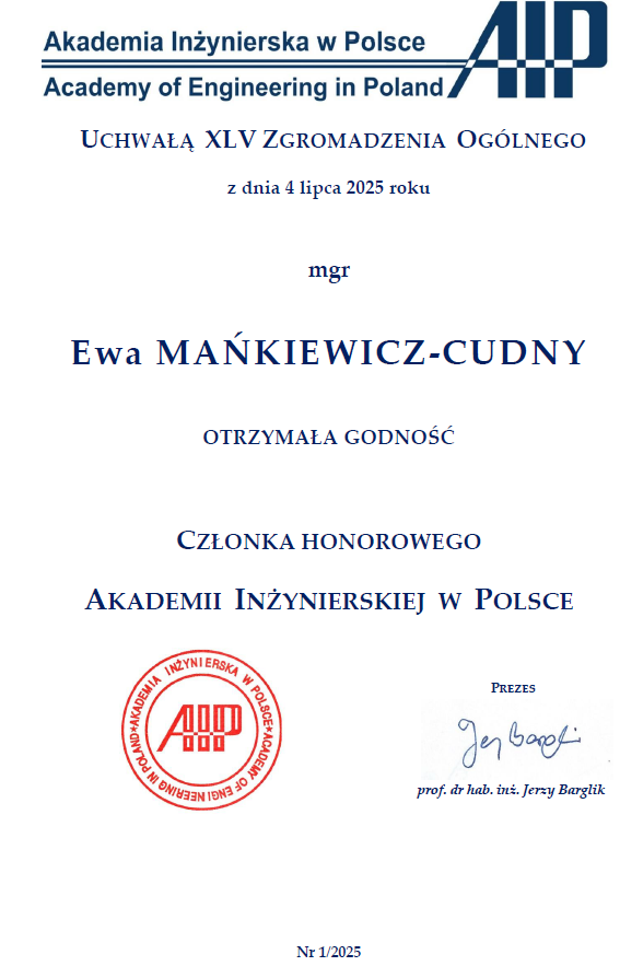 4 października podczas inauguracji roku akademickiego 2025/2026 w Akademii Górniczo Hutniczej odbyła się ceremonia wręczenia dyplomów członka honorowego. Prezes honorowy AIP Jerzy Barglik przestawił informację o działalności Akademii Nauk Technicznych (1920-1947) I Akademii Inżynierskiej w Polsce (1992-). Dyplomy z rąk rektora AGH Jerzego Lisa I prezesa honorowego AIP Jerzego Barglika otrzymali: prezes FSNT NOT Ewa Mańkiewicz Cudny oraz były rektor AGH Ryszard Tadeusiewicz.