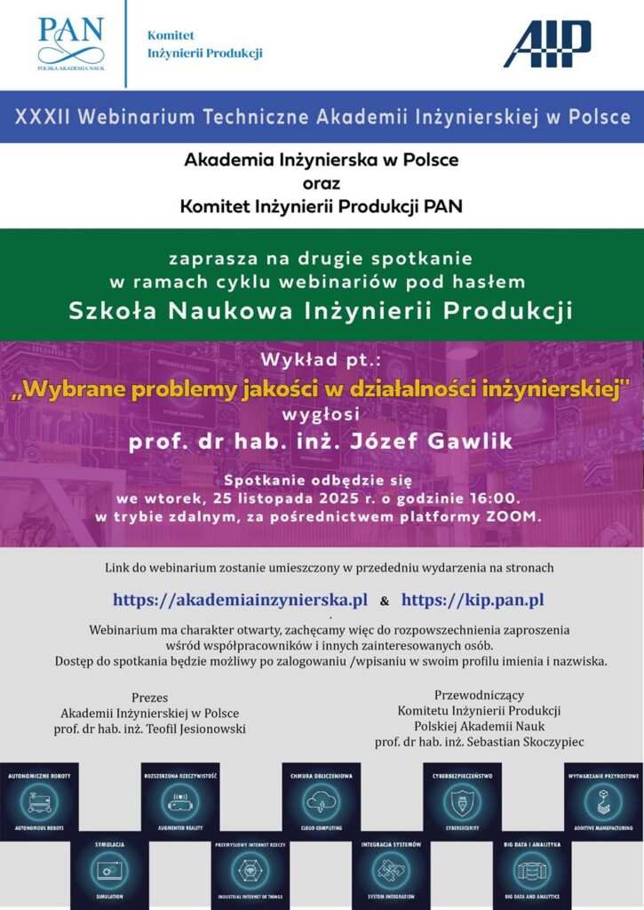 Komitet Inżynierii Produkcji oraz Akademia Inżynierska w Polsce zaprasza na drugie spotkanie w ramach cyklu webinariów pod hasłem Szkoła Naukowa Inżynierii Produkcji, które odbędzie się online 25 listopada 2025 r. o godzinie 16:00. Wykład pt. Wybrane problemy jakości w działalności inżynierskiej, wygłosi prof. dr hab. inż. Józef Gawlik. Spotkanie ma charakter otwarty, więc zachęcam do rozpowszechnienia zaproszenia wśród współpracowników i doktorantów. Link do webinarium zostanie umieszczony na stronie https://akademiainzynierska.pl w przededniu wydarzenia