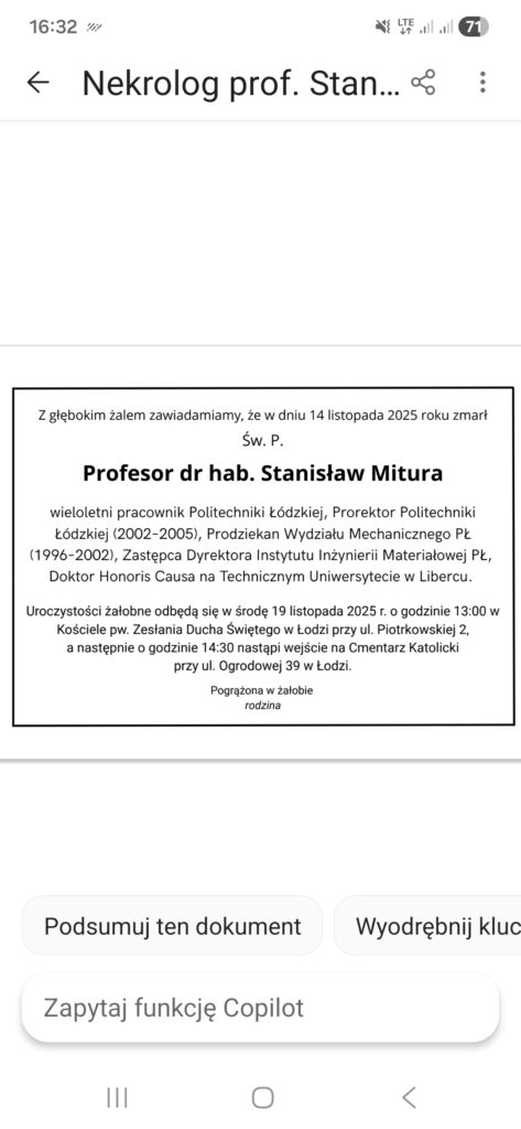 Szanowni Państwo, z głębokim żalem informuję, że w dniu 14 listopada 2025 r. zmarł prof. dr hab. Stanisław Mitura, członek AIP, wieloletni pracownik Politechniki Łódzkiej, Prorektor PŁ, Prodziekan Wydziału Mechanicznego PŁ, Zastępca Dyrektora Instytutu Inżynierii Materiałowej PŁ oraz Doktor Honoris Causa na Technicznym Uniwersytecie w Libercu. Uroczystości żałobne odbędą się w środę 19 listopada 2025 r. o godzinie 13:00 w Kościele pw. Zesłania Ducha Świętego w Łodzi, ul. Piotrkowska 2.Następnie o godzinie 14:30 odbędzie się wejście na Cmentarz Katolicki przy ul. Ogrodowej 39 w Łodzi.W załączeniu przesyłam nekrolog z pełnymi informacjami. Z wyrazami szacunku,